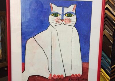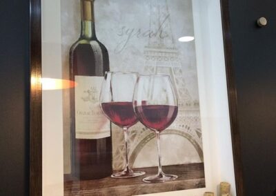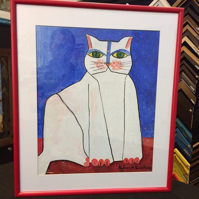 Uma linda gravura com um passe-partout branco, com moldura vermelha, vidro liso e foam board no fundo.
