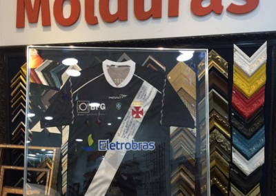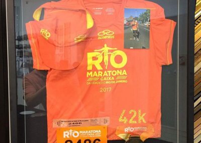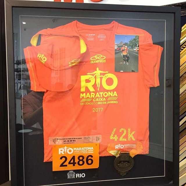 Olha que linda recordação. Nosso cliente juntou em um só quadro a sua foto, a camisa usada na maratona, o chapéu e a medalha. Gostou da idéia? Consulte-nos.